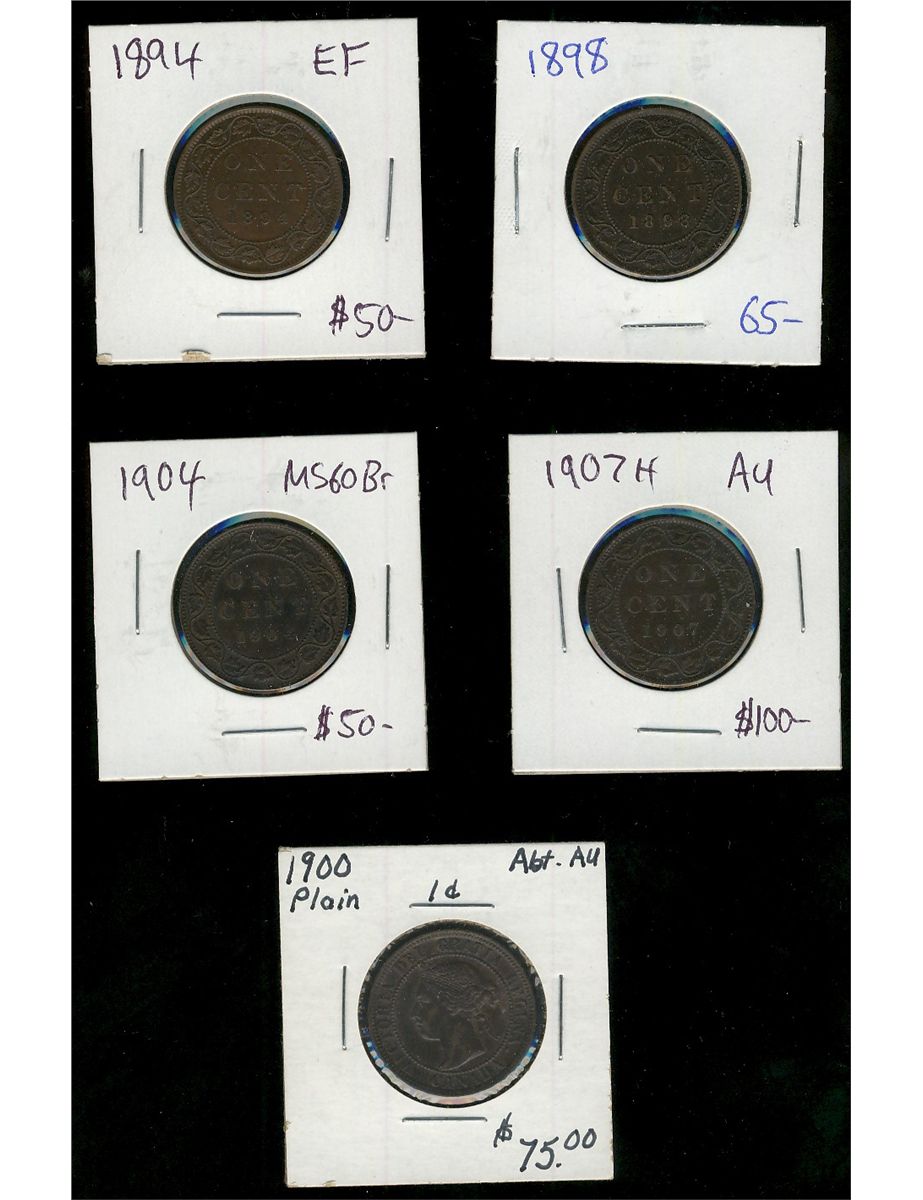 1894 1¢, 1898, 1900, 1904 & 1907H. Lot of 5 coins EF and better.