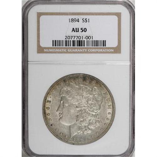 <B>1894 $1 AU50 NGC.</B></I> A luminous and lightly circulated tan-toned example of this famous low-mintage Morgan issue. Well struck with light, scattered flaws that have little impact on the overall visual appeal. One of only 110,000 pieces struck, this is an attractive and problem-free survivor that would fit well in a similarly graded set.<BR><BR><B>Coin Engraver:</B> George T. Morgan<BR><BR><b>Shipping:</b> Coins & Currency (<a target="_blank" href="http://www.heritageauctions.com/common/shipping.php">view shipping information</a>)