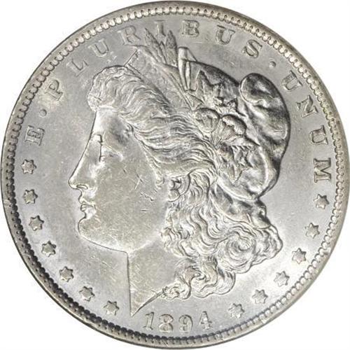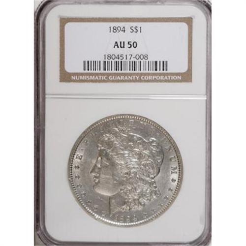 <B>1894 $1 AU50 NGC.</B></I> An impressive amount of flashy luster remains on both sides of this very lightly circulated, but very high-end AU50. The 1894 has the lowest mintage of all Philadelphia issues, aside from the proof-only 1895 and the presently offered example is very nearly untoned, brilliant, and extremely clean. Only a few scattered and inconsequential marks on the obverse rim are seen.<BR><BR><B>Coin Engraver:</B> George T. Morgan<BR><BR><b>Shipping:</b> Coins & Currency (<a target="_blank" href="http://www.heritageauctions.com/common/shipping.php">view shipping information</a>)