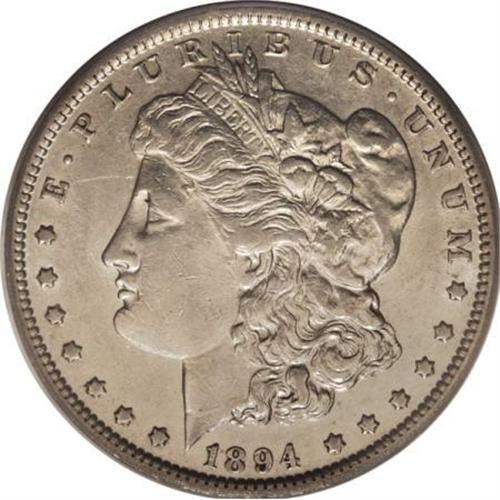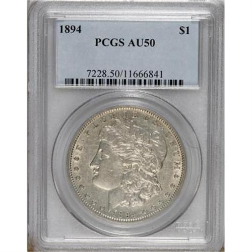 <B>1894 $1 AU50 PCGS.</B></I> Luster beckons from the eagle's plumage, Liberty's hair, and the stars and legends. A briefly circulated pearl-gray example of this key date silver dollar. An inconspicuous shallow abrasion is noted on the cheekbone. Only the 1893-S and 1895 have lower mintages.<BR><BR><b>Shipping:</b> Coins & Currency (<a target="_blank" href="http://www.heritageauctions.com/common/shipping.php">view shipping information</a>)