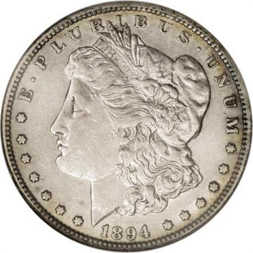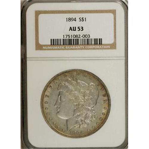 <B>1894 $1 AU53 NGC.</B></I> A lustrous silver-gray representative with amber toning about the obverse periphery and the expected number and severity of scattered abrasions. Morgan dollar collectors have long been drawn to this more difficult P-mint because of this comparatively brief mintage of just 110,00 business strikes.<BR><BR><B>Coin Engraver:</B> George T. Morgan<BR><BR><b>Shipping:</b> Coins & Currency (<a target="_blank" href="http://www.heritageauctions.com/common/shipping.php">view shipping information</a>\)