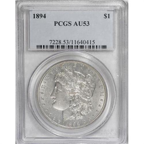 <B>1894 $1 AU53 PCGS.</B></I> A scarce and always sought-after date in the Morgan series, and an issue that is generally not located finer than AU. This is a brilliant coin with light friction over the highpoints. A couple of small marks on the cheek of Liberty are all that detract from the overall appearance of this piece. <BR><BR><b>Shipping:</b> Coins & Currency (<a target="_blank" href="http://www.heritageauctions.com/common/shipping.php">view shipping information</a>)