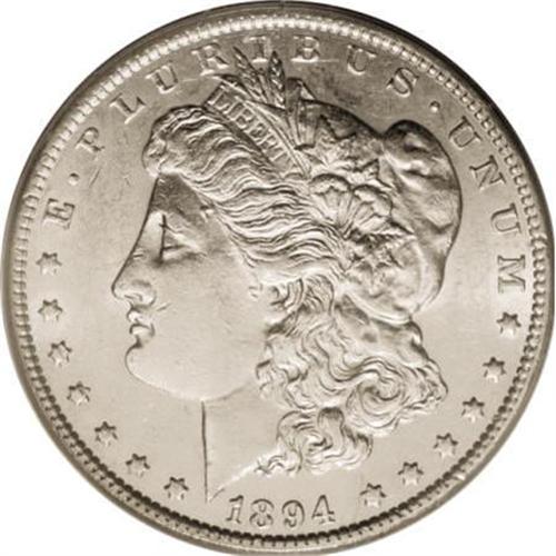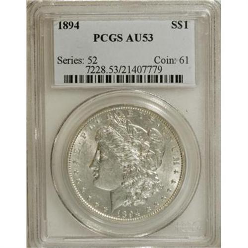 <B>1894 $1 AU53 PCGS.</B></I> The few light abrasions noted on Liberty's cheek attest to a short while in circulation, but most of the luster is still intact on this creamy silver-white coin, which boasts clean surfaces and considerable eye appeal. The first P-mint key date in the Morgan dollar series, and the lowest business-strike mintage save for the 1893-S.<BR><BR><B>Coin Engraver:</B> George T. Morgan<BR><BR><b>Shipping:</b> Coins & Currency (<a target="_blank" href="http://www.heritageauctions.com/common/shipping.php">view shipping information</a>\)
