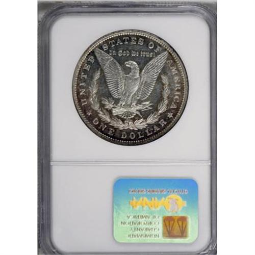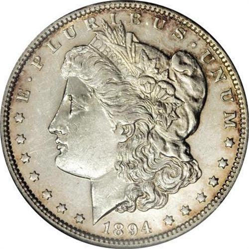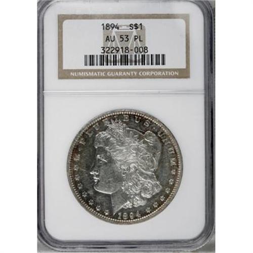 <B>1894 $1 AU53 Prooflike NGC.</B></I> Ex: Diamond Head Collection (Heritage, 8/07). Cherry-red toning endows the borders of this nicely struck and lightly worn key date dollar. The peripheries and devices exhibit bright luster. A couple of thin marks above the cap are of only minor importance. As the population data indicates, the 1894 P-mint Morgan is rare with prooflike surfaces. Census: 1 in 53 Prooflike, 11 finer (12/07).<BR><BR><B>Coin Engraver:</B> George T. Morgan<BR><BR><b>Shipping:</b> Coins & Currency (<a target="_blank" href="http://www.heritageauctions.com/common/shipping.php">view shipping information</a>)