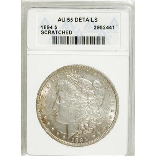 <B>1894 $1 --Scratched--ANACS. AU55 Details.</B></I> This would be a stupendous piece otherwise--strong details and luster, lovely pink-champagne, gold, and cerise colors--but some malefactor has scratched four deep incisions into Liberty's cheek, all visible to the naked eye. Elsewhere, as noted, the piece is quite nice.<BR><BR><B>Coin Engraver:</B> George T. Morgan<BR><BR><b>Shipping:</b> Coins & Currency (<a target="_blank" href="http://www.heritageauctions.com/common/shipping.php">view shipping information</a>)