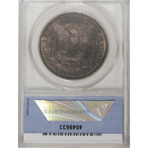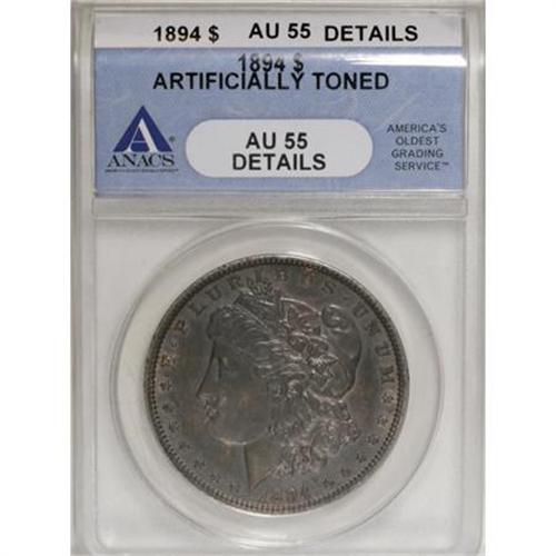 <B>1894 $1 --Artificially Toned--ANACS. AU55 Details.</B></I> Virtually Mint State with considerable luster hidden beneath deep and unnatural toning. Unnatural and unattractive are different words, and this artificially toned piece is still a desirable example.<BR><BR><B>Coin Engraver:</B> George T. Morgan<BR><BR><b>Shipping:</b> Coins & Currency (<a target="_blank" href="http://www.heritageauctions.com/common/shipping.php">view shipping information</a>)