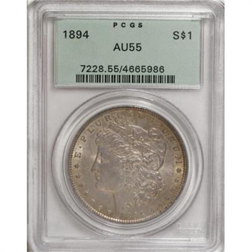 <B>1894 $1 AU55 PCGS.</B></I> Golden-tan patination becomes slightly deeper toward the peripheries of this Choice AU 1894 specimen, where it is joined by splashes of electric-blue and lavender on the reverse. Minimally abraded surfaces retain a good amount of luster, and exhibit well defined motifs. Highly desirable in all grades. Housed in a green-label holder.<BR><BR><B>Coin Engraver:</B> George T. Morgan<BR><BR><b>Shipping:</b> Coins & Currency (<a target="_blank" href="http://www.heritageauctions.com/common/shipping.php">view shipping information</a>)