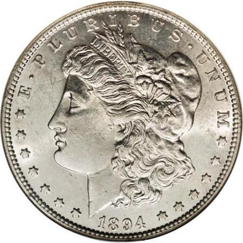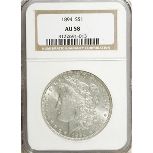 <B>1894 $1 AU58 NGC.</B></I> Most of the luster is still present on this silvery example, which is separated from Mint State by just a bit of rub and some light field chatter that attest to a short spate in circulation. A couple of small, dark toning spots appear on the reverse rim at about 12 o'clock.<BR><BR><B>Coin Engraver:</B> George T. Morgan<BR><BR><b>Shipping:</b> Coins & Currency (<a target="_blank" href="http://www.heritageauctions.com/common/shipping.php">view shipping information</a>)