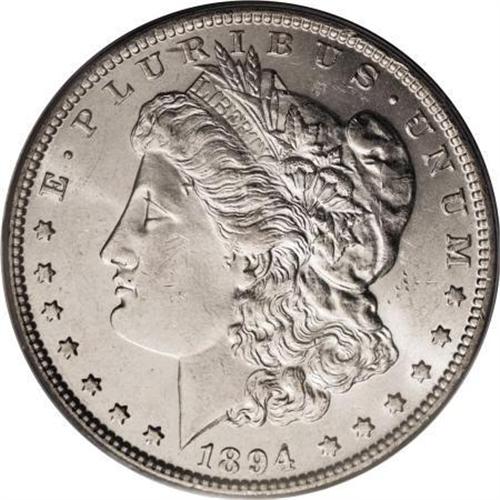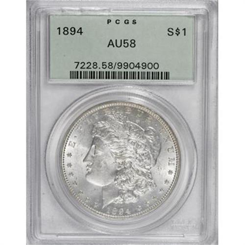<B>1894 $1 AU58 PCGS.</B></I> The cartwheel luster appears complete, but a trace of friction is noted on the eagle's breast and on the hair above the ear. The fields are refreshingly unmarked. The cheek has an inconspicuous thin and shallow scrape. The lowest mintage regular issue Philadelphia Morgan dollar. Encapsulated in a green label holder.<BR><BR><B>Coin Engraver:</B> George T. Morgan<BR><BR><b>Shipping:</b> Coins & Currency (<a target="_blank" href="http://www.heritageauctions.com/common/shipping.php">view shipping information</a>)