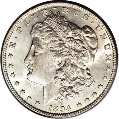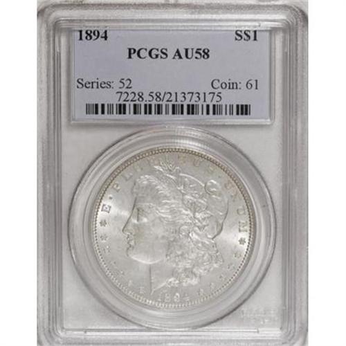 <B>1894 $1 AU58 PCGS.</B></I> The 1894 is an elusive date, coming from a limited mintage of 110,000 business strikes. Presented here is a high-end About Uncirculated example that retains considerable luster on essentially untoned surfaces that show the results of an impressive strike. We note a few trivial circulation marks.<BR><BR><B>Coin Engraver:</B> George T. Morgan<BR><BR><b>Shipping:</b> Coins & Currency (<a target="_blank" href="http://www.heritageauctions.com/common/shipping.php">view shipping information</a>)