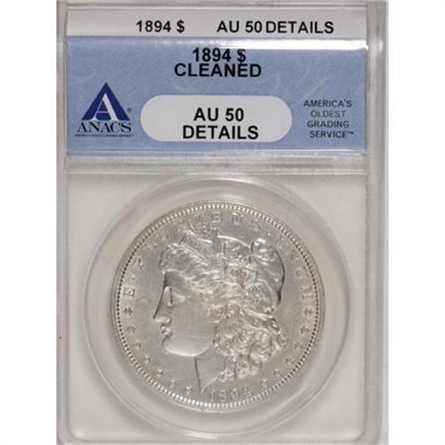 <B>1894 $1 --Cleaned--ANACS. AU50 Details.</B></I> The pale silver-gray surfaces of this 1894 dollar show subdued luster and moderate hairlines. Despite these flaws, it retains a measure of visual appeal and it shows just a hint of wear.<BR><BR><B>Coin Engraver:</B> George T. Morgan<BR><BR><b>Shipping:</b> Coins & Currency (<a target="_blank" href="http://www.heritageauctions.com/common/shipping.php">view shipping information</a>)
