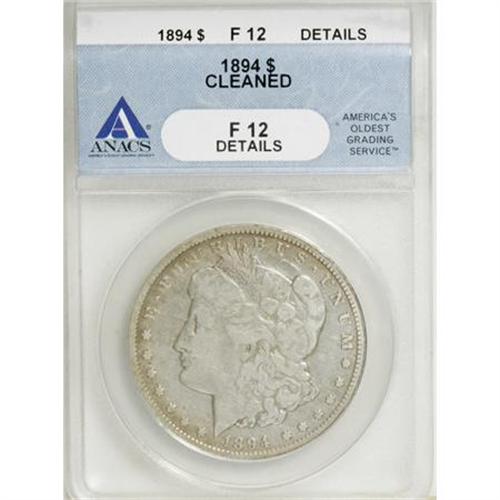 <B>1894 $1 --Cleaned--ANACS. Fine 12 Details.</B></I> A luminous silver-gray example that shows elements of russet near the rims. Appealing despite significant wear and mild impairment, an affordable representative of this low-mintage Philadelphia issue.<BR><BR><B>Coin Engraver:</B> George T. Morgan<BR><BR><b>Shipping:</b> Coins & Currency (<a target="_blank" href="http://www.heritageauctions.com/common/shipping.php">view shipping information</a>)