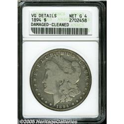 <B>1894<img border='0' src='http://www.heritagecoins.com/images/star.gif' width=10 height=10>$1 --Damaged, Cleaned--ANACS. VG Details, Net Good 4.</B></I> A lower grade and more affordable example of this scarcer P-mint from the mid-1890s. Fine hairlines are distributed over each side, and the and the silverish surfaces appear somewhat "washed out."