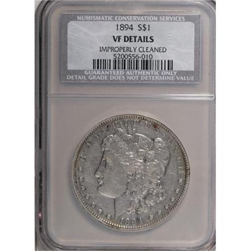 <B>1894 $1 --Improperly Cleaned--NCS. VF Details.</B></I> Bright silvery surfaces display some fine hairlines and a few minute contact marks. Generally well defined. This low-mintage issue is desirable in all grades.<BR><BR><B>Coin Engraver:</B> George T. Morgan<BR><BR><b>Shipping:</b> Coins & Currency (<a target="_blank" href="http://www.heritageauctions.com/common/shipping.php">view shipping information</a>)