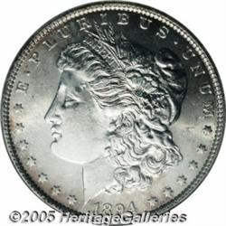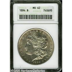 <B>1894<img border='0' src='http://www.heritagecoins.com/images/star.gif' width=10 height=10>$1 MS62 ANACS.</B></I> A rare and highly coveted Morgan in strict mint condition, only 110,972 pieces were struck and most of these entered circulation. This is a mostly brilliant coin with a typical soft strike and few abrasions for the grade. The luster is somewhat subdued.