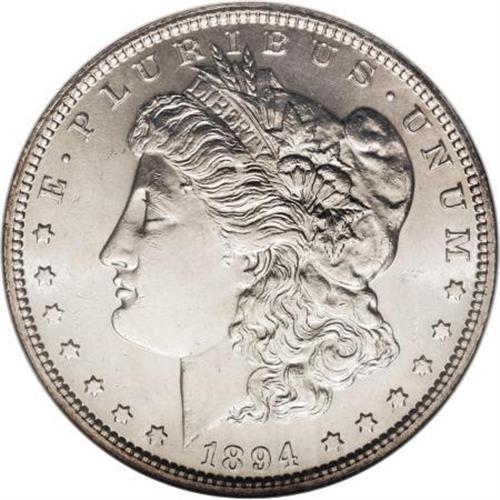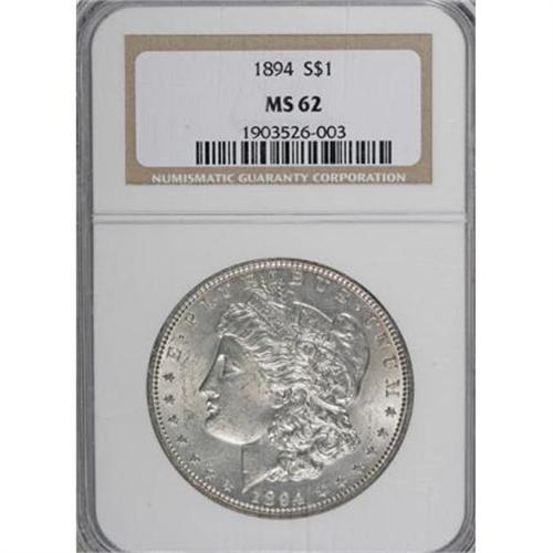 <B>1894 $1 MS62 NGC.</B></I> A gorgeous Mint State example with brilliant silver surfaces that appear free of any toning, other than a hint of gold at the extreme obverse border. Splendid quality with few marks of any significance, just the usual bagmarks that are expected at the grade level.<BR><BR><B>Coin Engraver:</B> George T. Morgan<BR><BR><b>Shipping:</b> Coins & Currency (<a target="_blank" href="http://www.heritageauctions.com/common/shipping.php">view shipping information</a>)