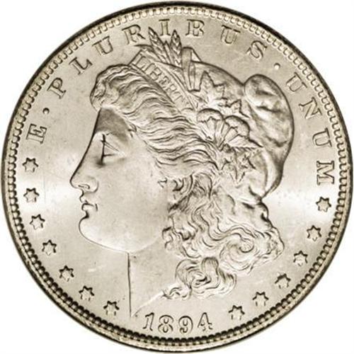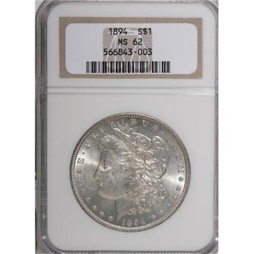<B>1894 $1 MS62 NGC.</B></I> The 1894 dollar has the smallest circulation-strike mintage (110,000 pieces) of any Philadelphia Mint issue, with the exception of the 1895. Mint State coins are mostly in the lower levels of Uncirculated. This MS62 example is essentially untoned and well struck. A few minor handling marks are noted, especially on the obverse.<BR><BR><B>Coin Engraver:</B> George T. Morgan<BR><BR><b>Shipping:</b> Coins & Currency (<a target="_blank" href="http://www.heritageauctions.com/common/shipping.php">view shipping information</a>)