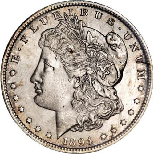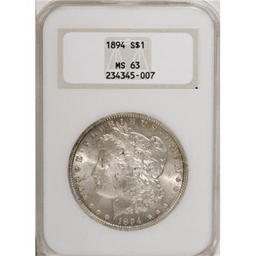 <B>1894 $1 MS63 NGC.</B></I> Delicate almond-gold and blue-green embrace the margins. The hair above the ear lacks absolute detail, but the strike is generally crisp. A lustrous and pleasantly unblemished example of this desirable low mintage issue. The fields are surprisingly mark-free. Housed in a prior generation holder.<BR><BR><B>Coin Engraver:</B> George T. Morgan<BR><BR><b>Shipping:</b> Coins & Currency (<a target="_blank" href="http://www.heritageauctions.com/common/shipping.php">view shipping information</a>)