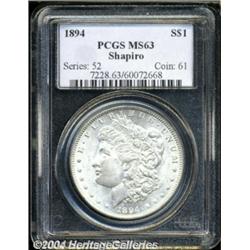 <table><tbody><tr><td><table> <TR><TD width="100%"><TABLE cellSpacing=1 cellPadding=3 width="100%" border=0><TBODY><TR><TD width="100%" bgColor=#79735c><FONT face=arial color=#ffffff size=3><B>Description</B> </FONT></TD></TR><TR><TD width="100%" bgColor=#ffffff><FONT face=arial size=2><B>1894 $1 MS63 PCGS.</B></I> Ex: Shapiro. The 1894 is a high visibility Morgan dollar. Only 110,972 pieces were struck, second only among Philadelphia issues to the enigmatic 1895. As one might assume (and rightfully so in this case), better grade examples are very elusive. This is a brilliant and well defined example that displays bright mint luster. The cheek of Liberty is curiously free from the abrasions that are usually seen on MS63 Morgans, with the most obvious mark being a scrape below the eagle's left (facing) wing. An impressive example of this pedigreed semi-key issue. Population: 211 in 63, 152 finer (10/03).<BR><I>From the Dylan Elijah Collection of Morgan Dollars.</B></I> </FONT></TD></TR></TBODY></TABLE></TD></TR></TBODY></TABLE><BR><A name=PricesRealized></A><TABLE cellSpacing=0 cellPadding=0 width="100%" bgColor=#000000 border=0><TBODY><TR><TD width="100%"><TABLE cellSpacing=1 cellPadding=3 width="100%" border=0><TBODY><TR><TD width="100%" bgColor=#79735c><A name=PR><FONT face=arial color=#ffffff size=3><B>Previous Prices from Heritage Auctions</B> </FONT></A></TD></TR><TR><TD bgColor=#f6f6ed><TABLE cellSpacing=0 cellPadding=0 width="100%" border=1><TBODY><TR><TD align=middle width="33%"><B>Date</B></TD><TD align=middle width="33%"><B>Service</B></TD><TD align=middle width="33%"><B>Price</B></TD></TR><TR bgColor=whitesmoke><TD width="33%"><B>07/29/2003</B></TD><TD width="33%">PCGS</TD><TD width="33%">$3,335.00</TD></TR><TR bgColor=whitesmoke><TD width="33%"><B>06/18/2002</B></TD><TD width="33%">PCGS</TD><TD width="33%">$2,817.50</TD></TR><TR bgColor=whitesmoke><TD width="33%"><B>02/08/2000</B></TD><TD width="33%">NGC</TD><TD width="33%">$2,000.00</TD></TR><TR bgColor=whitesmoke><TD width="33%"><B>11/07/2003</B></TD><TD width="33%">PCGS</TD><TD width="33%">$3,565.00</TD></TR><TR bgColor=whitesmoke><TD width="33%"><B>05/31/2003</B></TD><TD width="33%">PCGS</TD><TD width="33%">$3,565.00</TD></TR><TR bgColor=whitesmoke><TD width="33%"><B>05/31/2003</B></TD><TD width="33%">PCGS</TD><TD width="33%">$3,277.50</TD></TR><TR bgColor=whitesmoke><TD width="33%"><B>05/03/2003</B></TD><TD width="33%">PCGS</TD><TD width="33%">$3,105.00</TD></TR><TR bgColor=whitesmoke><TD width="33%"><B>01/11/2003</B></TD><TD width="33%">PCGS</TD><TD width="33%">$2,990.00</TD></TR><TR bgColor=whitesmoke><TD width="33%"><B>01/11/2003</B></TD><TD width="33%">NGC</TD><TD width="33%">$2,875.00</TD></TR><TR bgColor=whitesmoke><TD width="33%"><B>01/11/2003</B></TD><TD width="33%">ANACS</TD><TD width="33%">$3,162.50</TD></TR><TR bgColor=whitesmoke><TD width="33%"><B>11/23/2002</B></TD><TD width="33%">ANACS</TD><TD width="33%">$3,680.00</TD></TR><TR bgColor=whitesmoke><TD width="33%"><B>09/28/2002</B></TD><TD width="33%">PCGS</TD><TD width="33%">$2,990.00</TD></TR><TR bgColor=whitesmoke><TD width="33%"><B>04/27/2002</B></TD><TD width="33%">PCGS</TD><TD width="33%">$3,795.00</TD></TR><TR bgColor=whitesmoke><TD width="33%"><B>01/12/2002</B></TD><TD width="33%">PCGS</TD><TD width="33%">$2,788.75</TD></TR><TR bgColor=whitesmoke><TD width="33%"><B>11/15/2001</B></TD><TD width="33%">PCGS</TD><TD width="33%">$2,990.00</TD></TR><TR bgColor=whitesmoke><TD width="33%"><B>08/08/2001</B></TD><TD width="33%">PCGS</TD><TD width="33%">$3,335.00</TD></TR><TR bgColor=whitesmoke><TD width="33%"><B>05/31/2001</B></TD><TD width="33%">PCGS</TD><TD width="33%">$2,760.00</TD></TR><TR bgColor=whitesmoke><TD width="33%"><B>04/05/2001</B></TD><TD width="33%">PCGS</TD><TD width="33%">$2,587.50</TD></TR><TR bgColor=whitesmoke><TD width="33%"><B>01/05/2001</B></TD><TD width="33%">ANACS</TD><TD width="33%">$2,530.00</TD></TR><TR bgColor=whitesmoke><TD width="33%"><B>11/17/2000</B></TD><TD width="33%">PCGS</TD><TD width="33%">$2,990.00</TD></TR><TR bgColor=whitesmoke><TD width="33%"><B>08/13/1999</B></TD><TD width="33%">PCGS</TD><TD width="33%">$3,680.00</TD></TR><TR bgColor=whitesmoke><TD width="33%"><B>08/13/1999</B></TD><TD width="33%">NGC</TD><TD width="33%">$3,967.50</TD></TR><TR bgColor=whitesmoke><TD width="33%"><B>01/08/1999</B></TD><TD width="33%">NGC</TD><TD width="33%">$2,300.00</TD></TR><TR bgColor=whitesmoke><TD width="33%"><B>09/26/1998</B></TD><TD width="33%">NGC</TD><TD width="33%">$2,300.00</TD></TR><TR bgColor=whitesmoke><TD width="33%"><B>03/21/1998</B></TD><TD width="33%">PCGS</TD><TD width="33%">$2,645.00</TD></TR><TR bgColor=whitesmoke><TD width="33%"><B>01/10/1998</B></TD><TD width="33%">PCGS</TD><TD width="33%">$2,242.50</TD></TR><TR bgColor=whitesmoke><TD width="33%"><B>05/02/1997</B></TD><TD width="33%">PCGS</TD><TD width="33%">$2,310.00</TD></TR><TR bgColor=whitesmoke><TD width="33%"><B>02/06/1995</B></TD><TD width="33%">PCGS</TD><TD width="33%">$1,815.00</TD></TR><TR bgColor=whitesmoke><TD width="33%"><B>10/01/1993</B></TD><TD width="33%">PCGS</TD><TD width="33%">$1,567.50</TD></TR><TR bgColor=whitesmoke><TD width="33%"><B>05/22/1993</B></TD><TD width="33%">NGC</TD><TD width="33%">$1,595.00</TD></TR><TR bgColor=whitesmoke><TD width="33%"><B>01/01/2001</B></TD><TD width="33%">PCGS</TD><TD width="33%">$2,990.00</TD></TR><TR bgColor=whitesmoke><TD width="33%"><B>05/27/2001</B></TD><TD width="33%">NGC</TD><TD width="33%">$2,760.00</TD></TR><TR bgColor=whitesmoke><TD width="33%"><B>05/01/1995</B></TD><TD width="33%">ANACS</TD><TD width="33%">$1,623.00</TD></TR><TR bgColor=whitesmoke><TD width="33%"><B>09/01/1996</B></TD><TD width="33%">ANACS</TD><TD width="33%">$1,210.00</TD></TR><TR bgColor=whitesmoke><TD width="33%"><B>01/01/1997</B></TD><TD width="33%">NGC</TD><TD width="33%">$2,090.00</TD></TR><TR bgColor=whitesmoke><TD width="33%"><B>03/01/1999</B></TD><TD width="33%">NGC</TD><TD width="33%">$2,070.00</TD></TR><TR bgColor=whitesmok