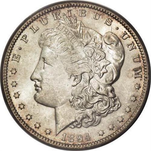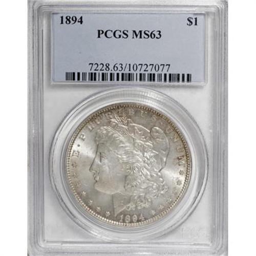 <B>1894 $1 MS63 PCGS.</B></I> Only 110,000 pieces were struck for circulation of the 1894 dollar. So few high grade Uncirculated pieces are known that the price of proof 1894s has long been elevated above other dates with similar mintages and survival rates. This is a solid Mint State coin that has smooth, satiny mint luster over both sides. Mostly brilliant, there is an accent of soft golden patina around the obverse and reverse rims. Well, but not fully struck, there are minimal abrasions present for a coin of this grade.<BR><I>From The Silver Spur Collection of Morgan Dollars.</B></I><BR><BR><B>Coin Engraver:</B> George T. Morgan<BR><BR><b>Shipping:</b> Coins & Currency (<a target="_blank" href="http://www.heritageauctions.com/common/shipping.php">view shipping information</a>)
