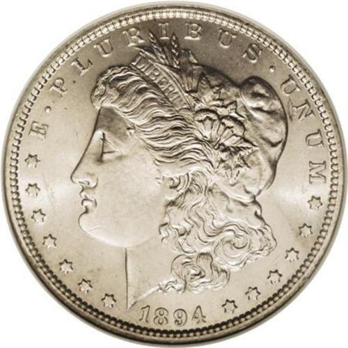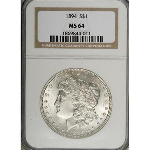 <B>1894 $1 MS64 NGC.</B></I> The 1894 dollar is elusive in all grades. Mint State coins are mostly in the MS60 to MS63 range. The availability falls off in MS64, and Gem quality pieces are rare. This near-Gem example possesses bright luster radiating from silver-gray surfaces that display generally well defined motifs. A handful of obverse marks define the grade. Census: 97 in 64, 4 finer (7/07).<BR><I>From The Arnold & Harriet Collection, Part Two.</B></I><BR><BR><B>Coin Engraver:</B> George T. Morgan<BR><BR><b>Shipping:</b> Coins & Currency (<a target="_blank" href="http://www.heritageauctions.com/common/shipping.php">view shipping information</a>)