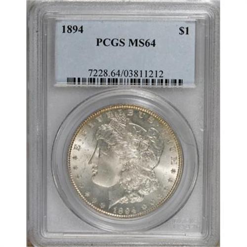 <B>1894 $1 MS64 PCGS.</B></I> Dollars of 1894 are highly desired in all grades. David Bowers (1993) writes: "Among Philadelphia Mint Morgan dollars, the 1894 is the second rarest (after 1901) in Mint State. Most coins are in lower Mint State ranges. The demand for the latter is softened somewhat by the availability of high-grade Proofs." A hint of light tan color concentrates at the rims of this radiantly lustrous near-Gem. The design elements are well defined, including fairly good detail in the hair at Liberty's ear and on the eagle's breast feathers. A few minor marks are consistent with the grade.<BR><BR><B>Coin Engraver:</B> George T. Morgan<BR><BR><b>Shipping:</b> Coins & Currency (<a target="_blank" href="http://www.heritageauctions.com/common/shipping.php">view shipping information</a>\)