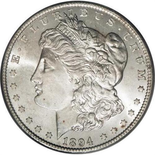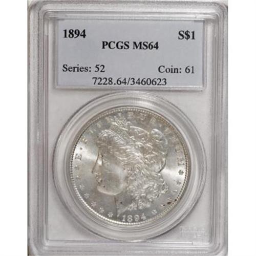 <B>1894 $1 MS64 PCGS.</B></I> A pleasing near-Gem in every regard. The strike is full and the surfaces display far fewer marks and imperfections than seen on many peer examples. The luster is exquisite and shimmering and it is untoned, save some passages of very light tan. 1894 Morgan dollars are among the most prized circulation-strike silver dollars for the series. Only the 1893-S has a smaller verifiable mintage, and the 1894's production of just 110,000 pieces, combined with limited distribution and subsequent melting, makes the issue a key. While a bag of the date appeared in Montana in 1961, most Mint State examples today are in lower grades. Collectors have only infrequent opportunities to bid on Select and Choice pieces, and between NGC and PCGS, the two services have graded just 27 pieces as Gem or better (11/07).<BR><I>From The Motor City Collection.</B></I><BR><BR><B>Coin Engraver:</B> George T. Morgan<BR><BR><b>Shipping:</b> Coins & Currency (<a target="_blank" href="http://www.heritageauctions.com/common/shipping.php">view shipping information</a>)