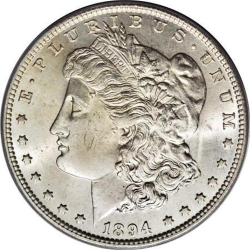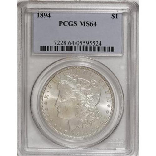 <B>1894 $1 MS64 PCGS.</B></I> Simply a delightful example of this true P-mint rarity, from a mintage of 110,972 pieces. A trace of pinkish-gold emanates from the centers, but the surfaces are still largely untoned. Close examination under a loupe reveals little evidence of post-strike contact, save for a series of reeding marks near the lowest arrowhead on the reverse. PCGS has certified only 23 coins in a higher grade, but this near-Gem will cost much less than an MS65, while maintaining appeal close to that level.<BR><I>From The Jimmy G. PCGS Registry Collection of Morgan Dollars with Varieties.</B></I><BR><BR><B>Coin Engraver:</B> George T. Morgan<BR><BR><b>Shipping:</b> Coins & Currency (<a target="_blank" href="http://www.heritageauctions.com/common/shipping.php">view shipping information</a>)