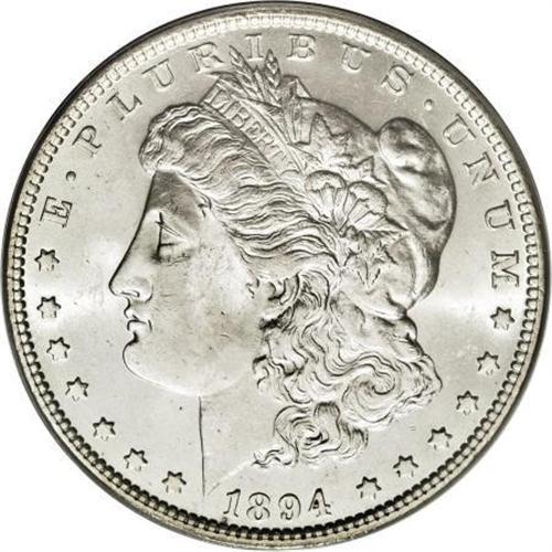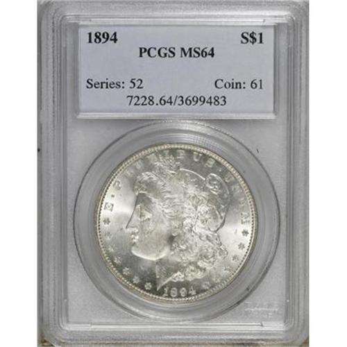 <B>1894 $1 MS64 PCGS.</B></I> A lustrous and lightly toned near-Gem that has only minor incompleteness of strike at the centers. This low mintage representative has a few wispy grazes on the cheek and neck, but the fields are smooth and the eye appeal is attractive. Tiny gray flecks near the date and the O in DOLLAR are of little import.<BR><BR><B>Coin Engraver:</B> George T. Morgan<BR><BR><b>Shipping:</b> Coins & Currency (<a target="_blank" href="http://www.heritageauctions.com/common/shipping.php">view shipping information</a>)