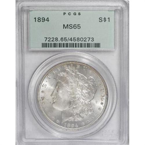 <B>1894 $1 MS65 PCGS.</B></I> With a mintage of just 110,000 coins, this issue is the first Morgan dollar rarity from the Philadelphia Mint, along with the proof-only 1895, and the conditionally rare 1901. While a few bags of 1894 Morgan dollars turned up during the middle of the 20th century, it does not appear that this date was part of the Treasury release that took place from 1962 to 1964.<BR> Mint State examples of this date are generally found at the lowest levels, and true Gems are extremely rare. The combined Mint State populations of NGC and PCGS show that just over 1,700 examples of this date have been certified in MS60 or higher grades, but only 28 of those pieces have been graded MS65 or better.<BR> Wayne Miller provides information about the distribution of this issue in The Morgan and Peace Dollar Textbook: "Since the 1894-P was minted in fewer quantities than any other business strike dollar except for the 1893-S, it is scarce in all grades. However, it is not as rare in uncirculated condition as might be expected. Because of its low mintage many pieces were undoubtedly set aside from the first days of issue. A solid bag of uncirculated 1894-P dollars surfaces in Great Falls, Montana in the early 1960s. These coins were widely dispersed, and account for a considerable percentage of the BU 1894-P dollars now in existence."<BR> This Gem is housed in a green-label PCGS holder, and it exhibits frosty silver luster with a few tiny specks or splashes of gold toning limited to the obverse. Both sides are sharply detailed, including the hair over Liberty's ear and the eagle's breast feathers. The surfaces are particularly pleasing, with only a few tiny luster grazes on each side. Population: 21 in 65, 3 finer (6/07).<BR><I>From the Reuben Reinstein Collection.</B></I><BR><BR><b>Shipping:</b> Coins & Currency (<a target="_blank" href="http://www.heritageauctions.com/common/shipping.php">view shipping information</a>)