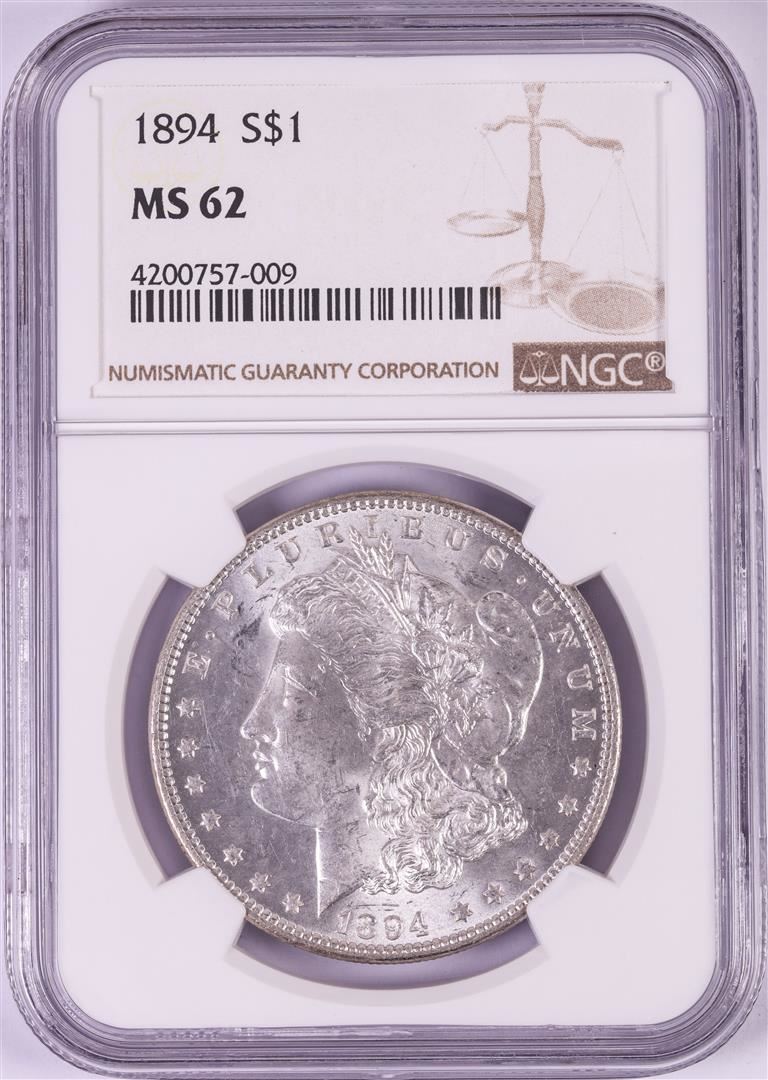 One 1894 $1 Morgan Silver Dollar Coin NGC MS62. NGC Certified.