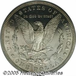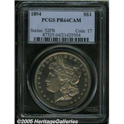 <B>1894<img border='0' src='http://www.heritagecoins.com/images/star.gif' width=10 height=10>$1 PR64 Cameo PCGS.</B></I> Appearing somewhat finer than the stated grade, both sides are appreciably smooth with no singularly mentionable blemishes. The strike is sharp (unlike that seen on many proof Morgans from a few of the preceding years), and both sides display delicate smoky-golden tinting. A desirable Choice proof representative of a P-mint Morgan with a limited business strike issue.