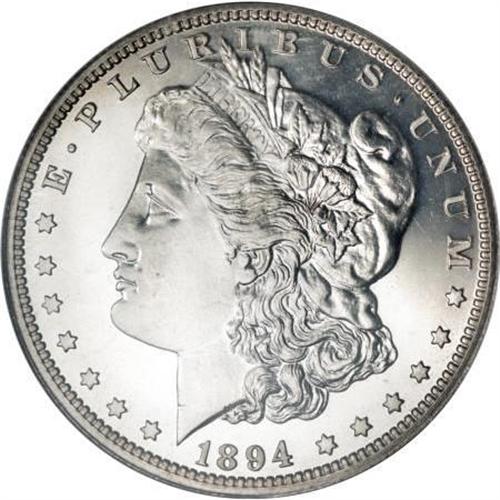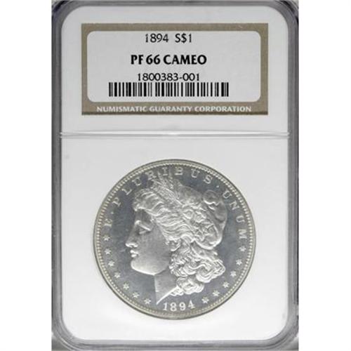 <B>1894 $1 PR66 Cameo NGC.</B></I> This fully struck Premium Gem appears completely brilliant at first glance, but careful rotation beneath a light reveals light pastel gold toning. The mirrored fields are undisturbed by contact or hairlines, and the eye appeal is exemplary. Only 972 proofs were issued. Census: 17 in 66, 33 finer (12/07).<BR><BR><b>Shipping:</b> Coins & Currency (<a target="_blank" href="http://www.heritageauctions.com/common/shipping.php">view shipping information</a>)
