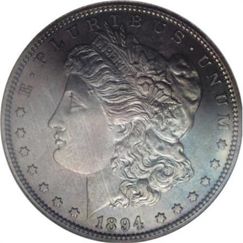 <B>1894 $1 PR66 NGC.</B></I> Both sides are cloaked in rich purple-violet, electric-blue, and sea-green toning that is likely the result of decades of storage in a paper envelope. Glittering mirrored reflectivity has no trouble penetrating the layers of color, and the underlying surfaces appear to be of impeccable quality. Fully struck and truly gorgeous. Census: 38 in 66, 37 finer (8/07). <BR><BR><B>Coin Engraver:</B> George T. Morgan<BR><BR><b>Shipping:</b> Coins & Currency (<a target="_blank" href="http://www.heritageauctions.com/common/shipping.php">view shipping information</a>)