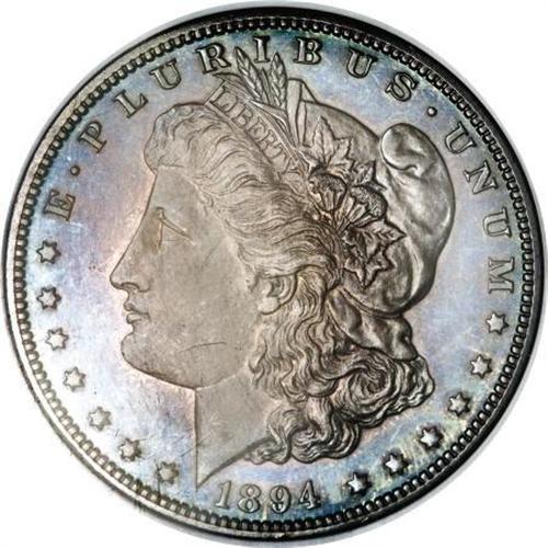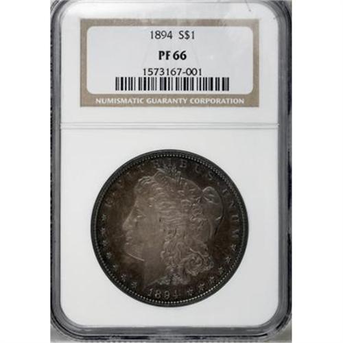 <B>1894 $1 PR66 NGC.</B></I> A deeply toned Premium Gem proof with dark-lilac that gradually changes to rich cobalt-blue, lighter rose, and amber when the coin is rotated under a light. Looking through the toning, cameo contrast remains evident on both sides. A splendid example. Census: 39 in 66, 36 finer (12/07).<BR><BR><B>Coin Engraver:</B> George T. Morgan<BR><BR><b>Shipping:</b> Coins & Currency (<a target="_blank" href="http://www.heritageauctions.com/common/shipping.php">view shipping information</a>)