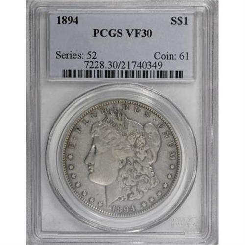 <B>1894 $1 VF30 PCGS.</B></I> Powder-blue and chestnut toning visit this moderately circulated key date Morgan dollar. Glimpses of luster still cling to the wing feathers, and the surfaces are free from obtrusive marks.<BR><BR><B>Coin Engraver:</B> George T. Morgan<BR><BR><b>Shipping:</b> Coins & Currency (<a target="_blank" href="http://www.heritageauctions.com/common/shipping.php">view shipping information</a>)