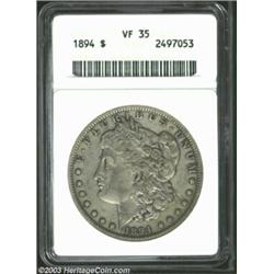 <TR><TD width="100%"><TABLE cellSpacing=1 cellPadding=3 width="100%" border=0><TBODY><TR><TD width="100%" bgColor=#79735c><FONT face=arial color=#ffffff size=3><B>Description</B> </FONT></TD></TR><TR><TD width="100%" bgColor=#ffffff><FONT face=arial size=2><B>1894 $1 VF35 ANACS.</B></I> The medium silver-gray fields and devices are outlined by a thin band of russet-brown patina. The eagle's wing plumage and Liberty's hair curls have ample definition, and the surfaces are not unduly marked for the Choice VF designation. </FONT></TD></TR></TBODY></TABLE></TD></TR></TBODY></TABLE><BR><A name=PricesRealized></A><TABLE cellSpacing=0 cellPadding=0 width="100%" bgColor=#000000 border=0><TBODY><TR><TD width="100%"><TABLE cellSpacing=1 cellPadding=3 width="100%" border=0><TBODY><TR><TD width="100%" bgColor=#79735c><A name=PR><FONT face=arial color=#ffffff size=3><B>Previous Prices from Heritage Auctions</B> </FONT></A></TD></TR><TR><TD bgColor=#f6f6ed><TABLE cellSpacing=0 cellPadding=0 width="100%" border=1><TBODY><TR><TD align=middle width="33%"><B>Date</B></TD><TD align=middle width="33%"><B>Service</B></TD><TD align=middle width="33%"><B>Price</B></TD></TR><TR bgColor=whitesmoke><TD width="33%"><B>08/08/2001</B></TD><TD width="33%">ANACS</TD><TD width="33%">$345.00</TD></TR></TBODY></TABLE></TD></TR><TR><TD bgColor=#ffffff><FONT face=arial size=1 ?>PLEASE NOTE: All prices realized reflect the final hammer price PLUS the buyer's premium in auctions that charge a buyer's premium. Each item has a notation at the top of the listing indicating whether that lot included a buyer's premium. Example: A item that sells with a final hammer price of $100 and a 20% buyer's premium will display with a price realized of $120. All information listed is intended to be as accurate as possible, but errors are possible. Please use this guide carefully and inform us of any inaccuracies. </FONT></TD></TR></TBODY></TABLE></TD></TR></TBODY></TABLE><BR><TABLE cellSpacing=0 cellPadding=0 width="100%" bgColor=#000000 border=0><TBODY><TR><TD width="100%"><TABLE cellSpacing=1 cellPadding=3 width="100%" border=0><TBODY><TR><TD width="100%" bgColor=#79735c colSpan=6><FONT face=arial color=#ffffff size=3><B>Price Guide*</B> </FONT></TD></TR><TR bgColor=#f6f6ed><TD align=middle><B>Grade</B> </TD><TD align=middle><B>Coin World<BR>(Trends)</B> </TD><TD align=middle><B>Numismedia<BR>Retail</B> </TD><TD align=middle><B>Numismedia<BR>Wholesale</B> </TD><TD align=middle><B>Coin<BR>Universe</B> </TD><TD align=middle><B>Heritage<BR>Value Index</B> </TD></TR><TR bgColor=#ffffff><TD align=middle>30</TD><TD align=right>---</TD><TD align=right>---</TD><TD align=right>---</TD><TD align=right>$415.00</TD><TD align=right>$389.00</TD></TR><TR style="FONT-WEIGHT: bold" bgColor=#cccfdd><TD align=middle>35</TD><TD align=right>---</TD><TD align=right>---</TD><TD align=right>---</TD><TD align=right>---</TD><TD align=right>$401.88</TD></TR><TR bgColor=#ffffff><TD align=middle>40</TD><TD align=right>$600.00</TD><TD align=right>$445.00</TD><TD align=right>$371.00</TD><TD align=right>$515.00</TD><TD align=right>$414.75</TD></TR><TR bgColor=#ffffff><TD colSpan=6><FONT size=1>*All information listed is intended to be as accurate as possible, but errors are possible. No item may be returned or refused based on this information which is provided as a service to our customers. You should contact each pricing source directly to determine the accuracy of this information. </FONT></TD></TR></TBODY></TABLE></TD></TR></TBODY></TABLE><BR><TABLE cellSpacing=0 cellPadding=0 width="100%" bgColor=#000000 border=0><TBODY><TR><TD width="100%"><TABLE cellSpacing=1 cellPadding=3 width="100%" border=0><TBODY><TR><TD width="100%" bgColor=#79735c><FONT face=arial color=#ffffff size=3><B>Population Guide</B> </FONT></TD></TR><TR bgColor=#ffffff><TD align=middle><!-- Begin Output of Population Grid--><TABLE cellSpacing=0 cellPadding=0 width="100%" border=0><TBODY><TR><TD vAlign=center><TABLE cellSpacing=0 width="100%" border=1 cellsadding="3"><TBODY><TR><TD vAlign=center><TABLE cellSpacing=0 cellPadding=3 width="100%" border=1><TBODY><TR><TD vAlign=center align=middle bgColor=#f0f1e8 colSpan=2 <CENTER><FONT face=Arial size=2><B>PCGS Pop </B></FONT><CENTER></CENTER></TD><TD vAlign=center align=middle bgColor=#f0f1e8 colSpan=2><CENTER><FONT face=Arial size=2><B>NGC Pop</B></CENTER></FONT></TD></TR><TR><TD vAlign=center><FONT face=Arial size=2>(35)</FONT> </TD><TD vAlign=center align=right><FONT face=Arial size=2>40</FONT> </TD><TD vAlign=center><FONT face=Arial size=2>(35)</FONT> </TD><TD vAlign=center align=right><FONT face=Arial size=2>19</FONT> </TD></TR><TR><TD vAlign=center><FONT face=Arial size=2>(>35)</FONT> </TD><TD vAlign=center align=right><FONT face=Arial size=2>1433</FONT> </TD><TD vAlign=center><FONT face=Arial size=2>(>35)</FONT> </TD><TD vAlign=center align=right><FONT face=Arial size=2>734</FONT> </TD></TR></TBODY></TABLE></TD></TR></TBODY></TABLE></TD></TR></TBODY></TABLE><!-- End Output of Population Grid--></TD></TR></TBODY></TABLE></TD></TR></TBODY></TABLE><BR><TABLE cellSpacing=0 cellPadding=0 width="100%" bgColor=#000000 border=0><TBODY><TR> Important notice: We expect to be auctioning lots at the rate of 200-250 per hour. On occasion eBay live bid software cannot keep up with the pace of the auctions where 4-5 lots per minute can hammer down, so we recommend that you place a realistic absentee bid now as insurance to avoid disappointment. Also please note that all Heritage/CAA lots purchased through eBay Live carry a 20% Buyer's Premium. Please make sure you read the Terms and Conditions.