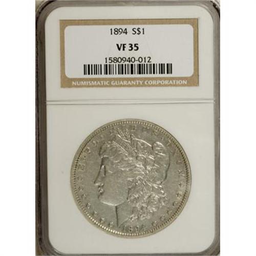 <B>1894 $1 VF35 NGC.</B></I> A predominantly steel-gray example of this often-elusive issue, which has one of the lowest mintages of any Morgan dollar issue. Lightly abraded overall with a spot of orange at the eagle's neck and another near 2 o'clock on the reverse rim.<BR><I>From The Laguna Niguel Collection, Part One.</B></I><BR><BR><B>Coin Engraver:</B> George T. Morgan<BR><BR><b>Shipping:</b> Coins & Currency (<a target="_blank" href="http://www.heritageauctions.com/common/shipping.php">view shipping information</a>\)