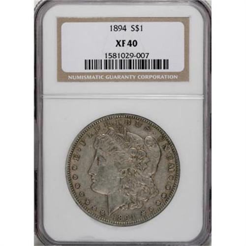 <B>1894 $1 XF40 NGC.</B></I> A well struck example from this tiny-mintage issue of 110,000 pieces, luminous at the margins with gold-gray and rose patina over each side. The devices exhibit light, even wear, and the fields show a number of light, scattered abrasions that contribute to the grade.<BR><BR><B>Coin Engraver:</B> George T. Morgan<BR><BR><b>Shipping:</b> Coins & Currency (<a target="_blank" href="http://www.heritageauctions.com/common/shipping.php">view shipping information</a>)