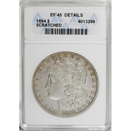 <B>1894 $1 --Scratched--ANACS. XF45 Details.</B></I> This low mintage tan-gray Morgan dollar retains some luster within the wings, curls, and letters. An idle hour from long ago caused several pinscratches on each side, with the most noticeable on the portrait. The obverse rim has a small ding at 10:30.<BR><BR><B>Coin Engraver:</B> George T. Morgan<BR><BR><b>Shipping:</b> Coins & Currency (<a target="_blank" href="http://www.heritageauctions.com/common/shipping.php">view shipping information</a>)