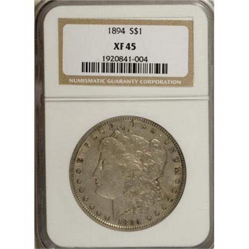 <B>1894 $1 XF45 NGC.</B></I> A touch of rose graces the subtly lustrous silver-gray surfaces of this Choice XF example. Well struck with few marks and a touch of gold in the reverse fields, as well as slightly deeper toning near the devices. A great lightly circulated example of this Philadelphia key.<BR><BR><B>Coin Engraver:</B> George T. Morgan<BR><BR><b>Shipping:</b> Coins & Currency (<a target="_blank" href="http://www.heritageauctions.com/common/shipping.php">view shipping information</a>\)