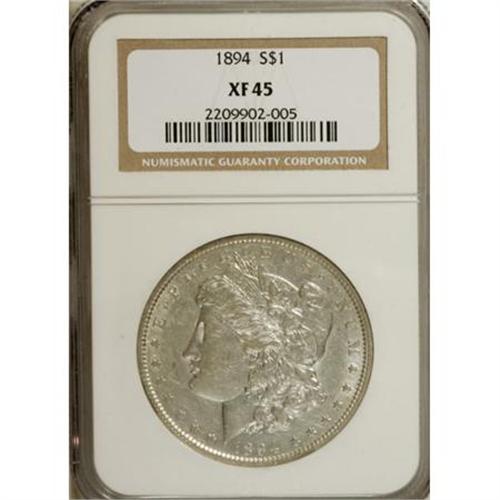 <B>1894 $1 XF45 NGC.</B></I> This low-mintage date is highly desired in all grades. We present here a super Choice XF coin that displays traces of luster in the protected areas. Bright untoned surfaces reveal just a few minor marks.<BR><BR><B>Coin Engraver:</B> George T. Morgan<BR><BR><b>Shipping:</b> Coins & Currency (<a target="_blank" href="http://www.heritageauctions.com/common/shipping.php">view shipping information</a>\)
