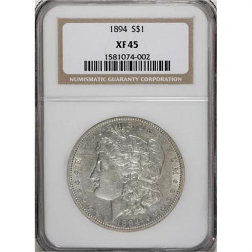 <B>1894 $1 XF45 NGC.</B></I> Whispers of olive-green visit both sides of this Choice XF specimen that displays traces of luster in the protected areas. Nicely defined, and devoid of significant marks. The 1894 is elusive in all grades.<BR><BR><B>Coin Engraver:</B> George T. Morgan<BR><BR><b>Shipping:</b> Coins & Currency (<a target="_blank" href="http://www.heritageauctions.com/common/shipping.php">view shipping information</a>)