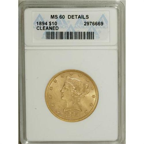 1894 $10 --Cleaned--ANACS. MS60 Details. NGC Census