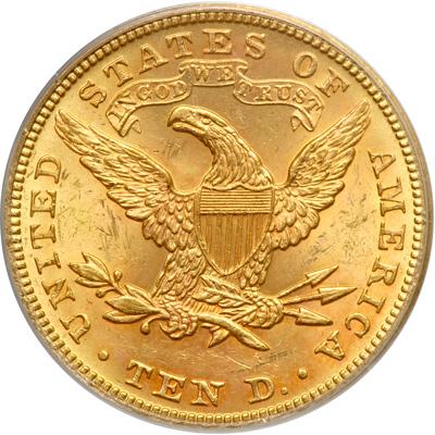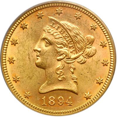 1894 $10 Liberty. PCGS graded MS-62. Frosty with delicate golden toning (PCGS # 8729).