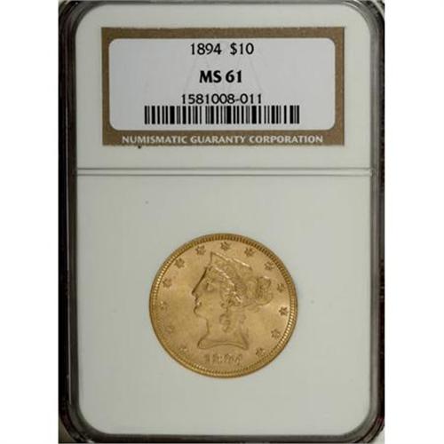 <B>1894 $10 MS61 NGC.</B></I> NGC Census: (7874/14037). PCGS Population (4768/6501). Mintage: 2,470,778. Numismedia Wsl. Price for NGC/PCGS coin in MS61: $375. (#8729)<BR><BR><B>Coin Engraver:</B> Christian Gobrecht<BR><BR><b>Shipping:</b> Coins & Currency (<a target="_blank" href="http://www.heritageauctions.com/common/shipping.php">view shipping information</a>)