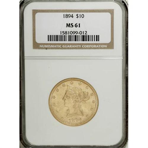 <B>1894 $10 MS61 NGC.</B></I> NGC Census: (7874/14037). PCGS Population (4769/6519). Mintage: 2,470,778. Numismedia Wsl. Price for NGC/PCGS coin in MS61: $375. (#8729)<BR><BR><B>Coin Engraver:</B> Christian Gobrecht<BR><BR><b>Shipping:</b> Coins & Currency (<a target="_blank" href="http://www.heritageauctions.com/common/shipping.php">view shipping information</a>)