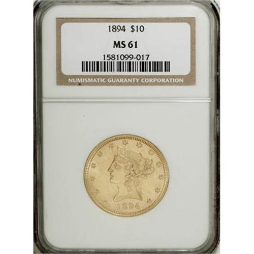 <B>1894 $10 MS61 NGC.</B></I> NGC Census: (7874/14037). PCGS Population (4769/6519). Mintage: 2,470,778. Numismedia Wsl. Price for NGC/PCGS coin in MS61: $375. (#8729)<BR><BR><B>Coin Engraver:</B> Christian Gobrecht<BR><BR><b>Shipping:</b> Coins & Currency (<a target="_blank" href="http://www.heritageauctions.com/common/shipping.php">view shipping information</a>)