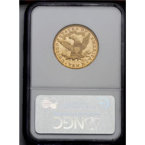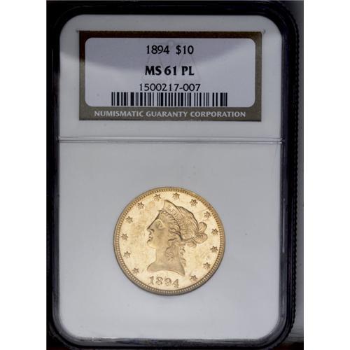 <B>1894<$10> MS61 Prooflike NGC.</B></I> The dazzling prooflike fields display numerous small marks. Red-gold color and bold striking details increase its eye appeal. An attractive and conditionally scarce example.