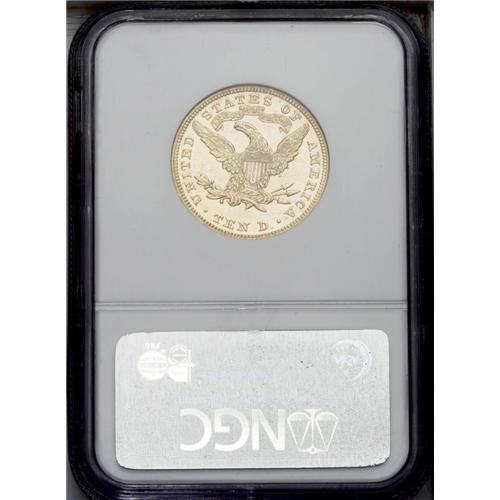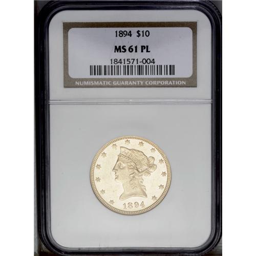 <B>1894 $10 MS61 Prooflike NGC.</B></I> The motif-field contrast on this 1894 eagle is evident at all angles, and jumps out at the viewer. Indeed, the finish can be described as gold-on-black, and excellent definition is noted throughout. A grade or two higher is precluded by a few too many contact marks, especially on the obverse. Nevertheless, this is truly a pretty coin for an MS61.<BR><BR><b>Shipping:</b> Coin/Currency (<a target="_blank" href="http://www.heritageauctions.com/common/shipping.php">view shipping information</a>) <BR><BR><B>Important notice: